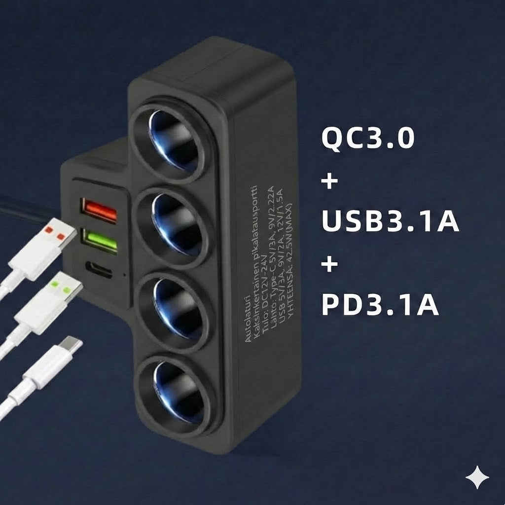 Tee lopullinen loppu riidoille siitä, kuka saa käyttää laturia pitkillä ajomatkoilla. Tällä 7-in-1-adapterilla muutat yhden ainoan pistorasian valtavaksi keskukseksi, jossa on neljä 12V/24V-liitäntää ja kolme USB-porttia. Tämä tarkoittaa, että voit ladata jopa seitsemää laitetta samanaikaisesti, jolloin vältät jonotuksen latauspisteille tien päällä. Olipa kyseessä perheloma tai työmatka, kaikilla matkustajilla on aina virtaa saatavilla ilman kompromisseja.