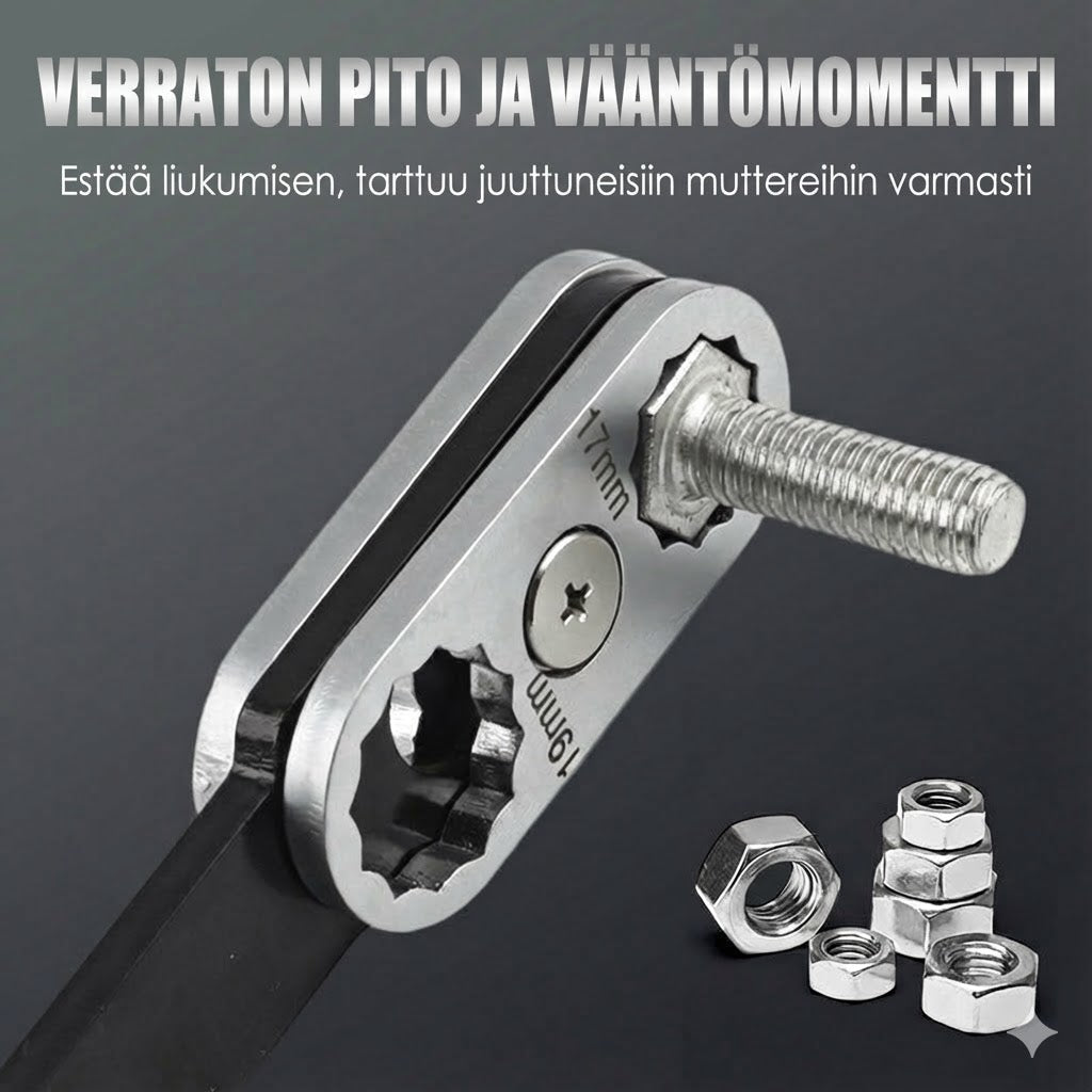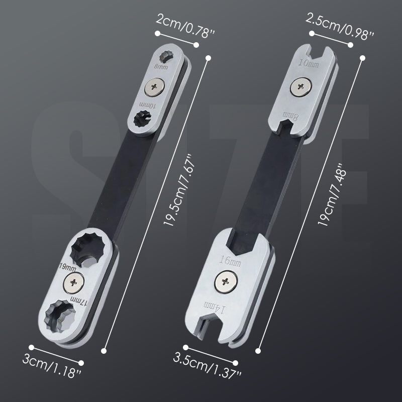 Remplacez votre boîte à outils encombrante et lourde par cette solution intelligente tout-en-un. Grâce à sa tête rotative innovante à 360°, vous passez en un clin d'œil d'une taille à l'autre parmi huit dimensions différentes, ce qui vous fait gagner un temps précieux et vous évite de chercher la bonne clé pendant des heures. Ce système élimine le besoin d'une collection d'outils désordonnée et rend votre espace de travail immédiatement plus efficace et organisé.