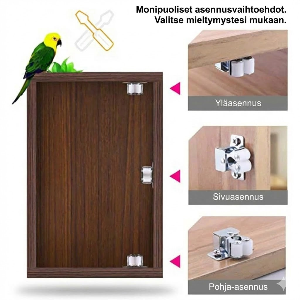 Ärsyttääkö sinua se yksi kaapinovi, joka aukeaa kerta toisensa jälkeen? Tällä vankalla rullasalvalla estät tavaroiden yllättävän putoamisen kaapeista pitkäaikaisen käytön jälkeen. Tehokas kaksoisrullarakenne 1 kg:n sulkuvoimalla pitää kaiken turvallisesti paikoillaan. Tämä on ihanteellinen tapa luoda välitöntä turvallisuutta ja järjestystä keittiöön tai makuuhuoneeseen ilman, että joudut ostamaan kalliita uusia saranoita.